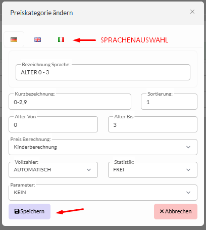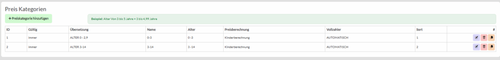 Preiskategorien dienen zur Kinderberechnung und der richtigen Hinterlegung von Fixleistungen wie zum Beispiel jene der Ortstax(en).