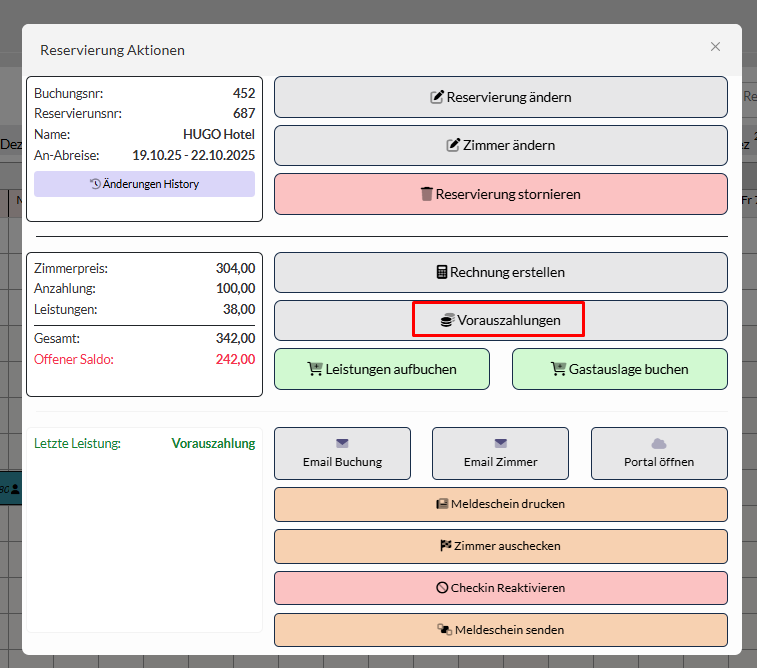 Mit Klick auf die Reservierung gelangen Sie in die Maske der Reservierung Aktionen. Klicken Sie dort auf den Button „Vorauszahlungen“.
