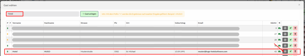Suchen Sich nach dem Gast und bestätigen Sie Ihre Wahl mit Klick auf den Haken.