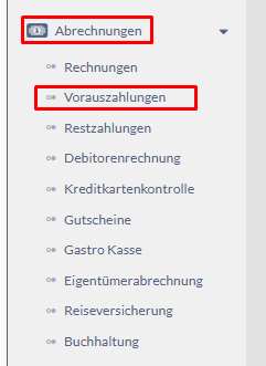 Klicken Sie im Menü auf Abrechnungen – Vorauszahlungen und wählen Sie bei Typ der Vorauszahlung – „bezahlte Vorauszahlungen“ aus.