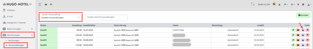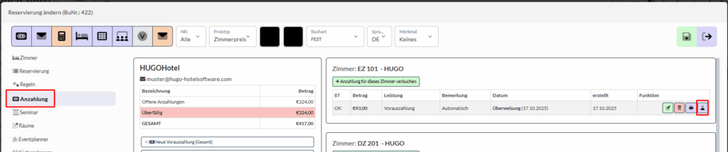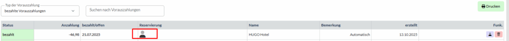 Es öffnet sich die Ansicht der beim Gast gebuchten Anzahlungen.