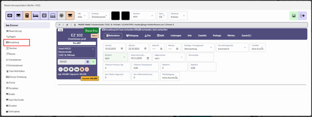 Klicken Sie auf die gewünschte Reservierung und wählen Sie im Menü der Reservierung den Unterreiter „Anzahlung“ aus.