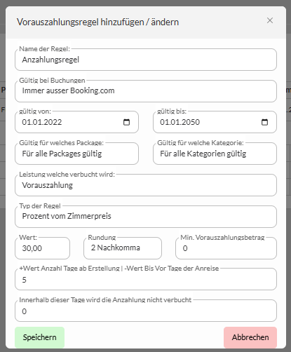 Diese Einstellungsmöglichkeit ermöglicht es Ihnen unterschiedliche Anzahlungsregeln für unterschiedliche Zeiträume zu hinterlegen.