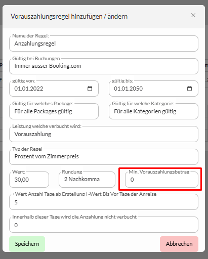 Wenn Sie keinen prozentuellen Anzahlungsbetrag wünschen, sondern einen festen Wert, hinterlegen Sie bei Min.Vorauszahlungsbetrag den gewünschten Wert in ganzen Zahlen.