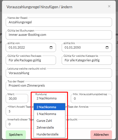 Hier können Sie die gewünschte Rundung des Anzahlungsbetrages hinterlegen.