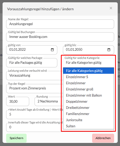 Beachten Sie, dass wenn Sie einer Kategorie eine spezielle Anzahlungsregel zuweisen, sie auch allen anderen Kategorien die allgmein gültige Anzahlungsregel zuweisen müssen.