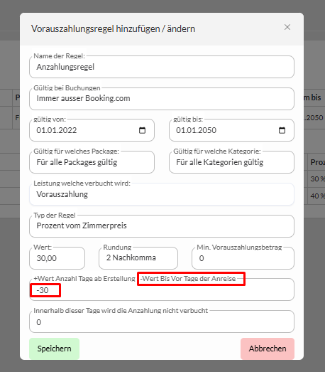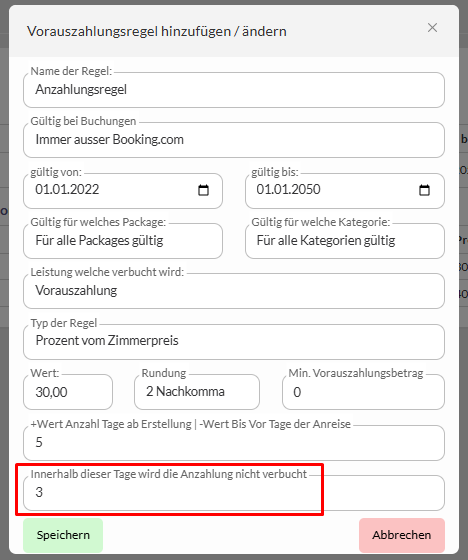 Angenommen, sie hinterlegen eine „3“ in diesem Feld, bedeutet das, dass die Anzahlung 3 Tage vor der geplanten Anreise nicht mehr verbucht wird.