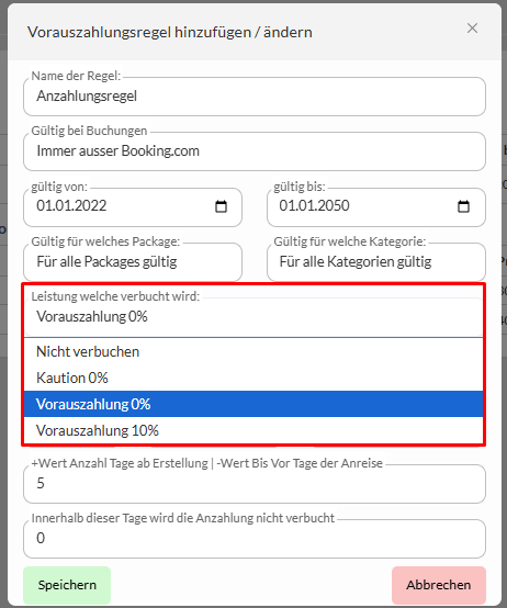 Wählen Sie hier aus, wann die Anzahlungsregel gültig sein soll.