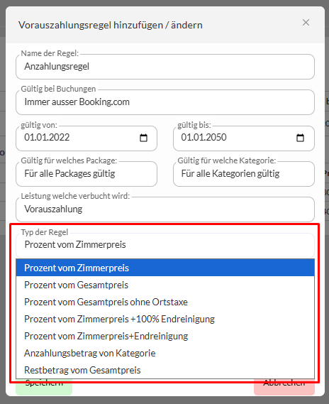 Bei „Typ der Regel“ definieren Sie von welchem Preis ausgehend der Anzahlungsbetrag berechnet werden soll.