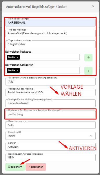 Beispiel: Eine Buchung hat zwei Zimmer es werden zwei E-Mails verschickt