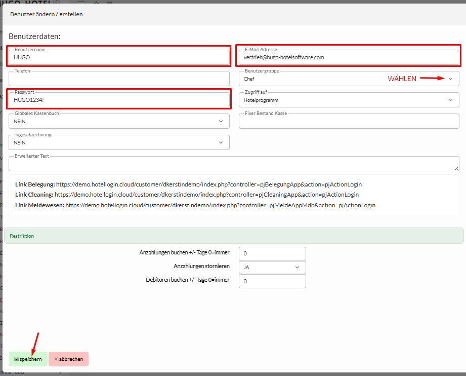 Bei den Benutzern können Sie ebenso die Berechtigung für die Cleaning App/ Hausmeister App hinterlegen.