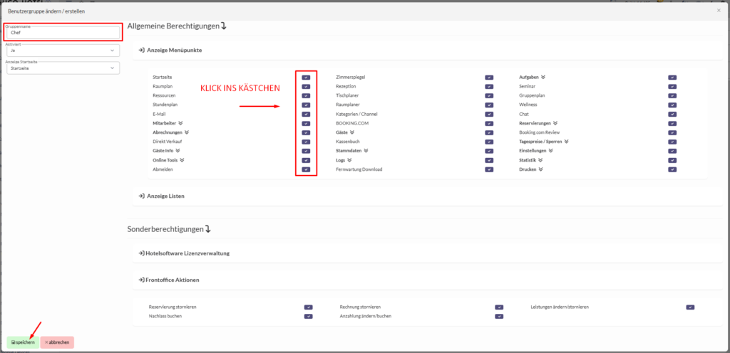Wählen Sie einen Gruppennamen aus und vergeben Sie, die für diese Benutzergruppe benötigten Berechtigungen, durch das Setzen eines Hakens hinter den ausgewählten Menüpunkten und/oder Listen.