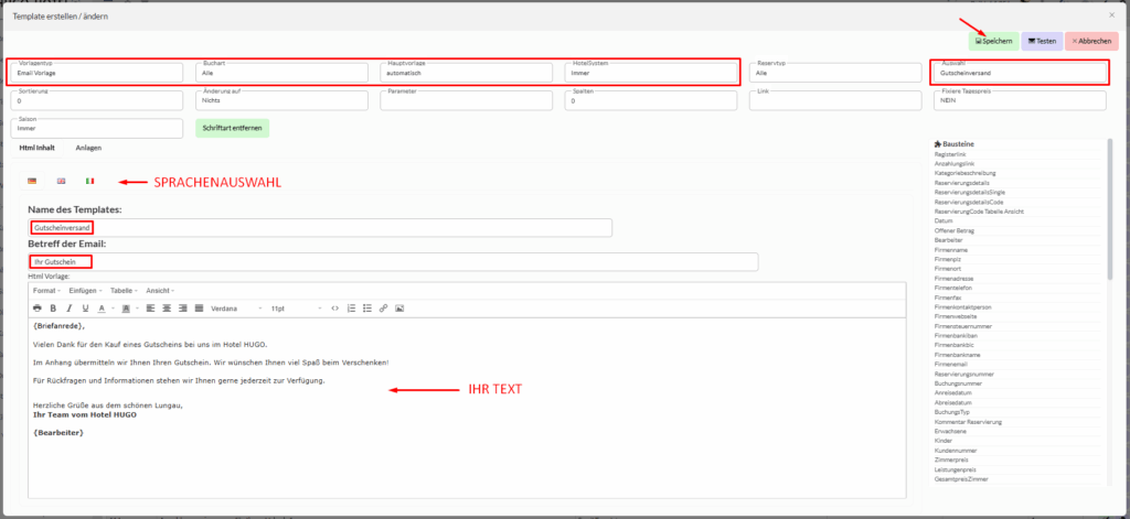 Klicken Sie auf + Vorlage erstellen und geben Sie Ihren Text mit Hilfe von Textbausteinen ein.