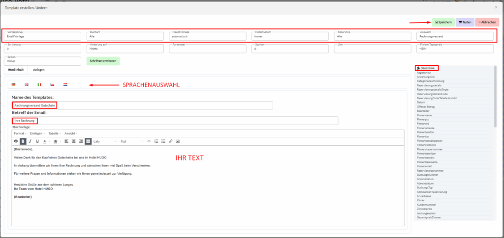 Klicken Sie auf + Vorlage erstellen und geben Sie Ihren Text mit Hilfe von Textbausteinen ein.