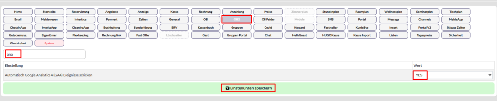 Dafür klicken Sie im Menü auf „Einstellungen – Softwareeinstellungen“ und suchen Sie beim Reiter „OB2“ nach der Einstellung „Automatisch Google Analytics 4 (GA4) Ereignisse schicken – stellen Sie die Einstellung auf „YES“ um und speichern Sie die Einstellung.