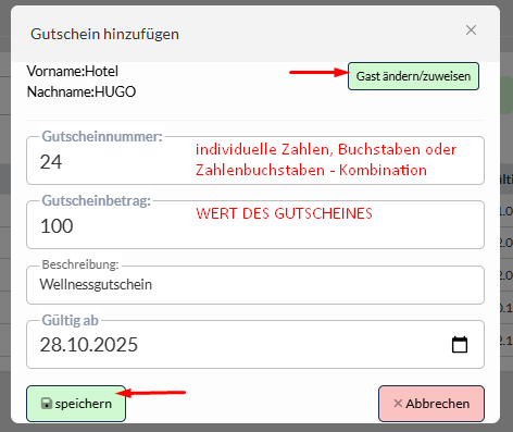 Weisen Sie dem Gutschein einen Gast zu*, geben Sie dem Gutschein eine individuelle Zahlen, Buchstaben oder Zahlenbuchstaben – Kombination sowie eine Beschreibung und ein Datum, ab wann der Gutschein gültig ist.