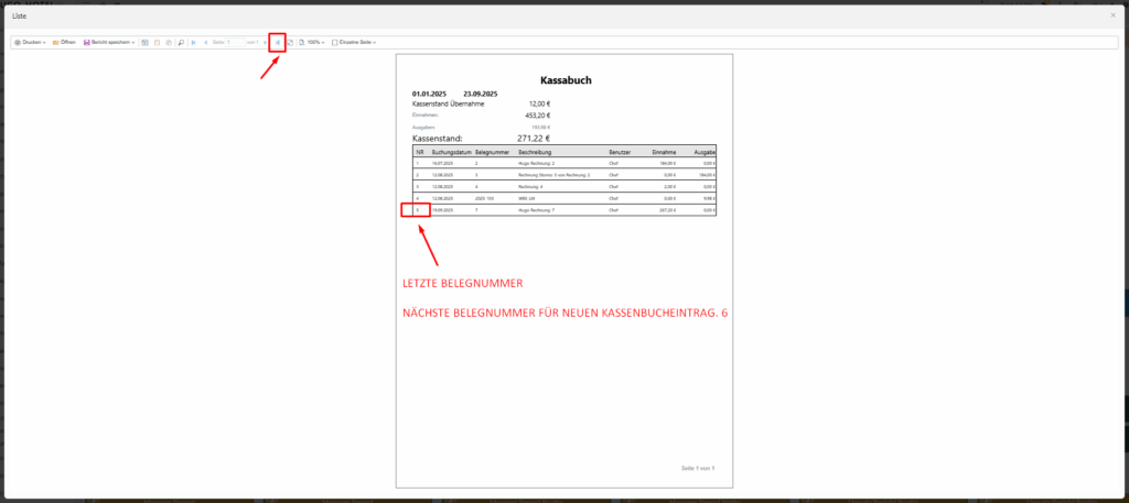 Fortlaufende Belegnummer: 6 (*gefunden unter: „Drucken – Buchhaltung – Kassenbuch, Von – bis; letzte Seite“)