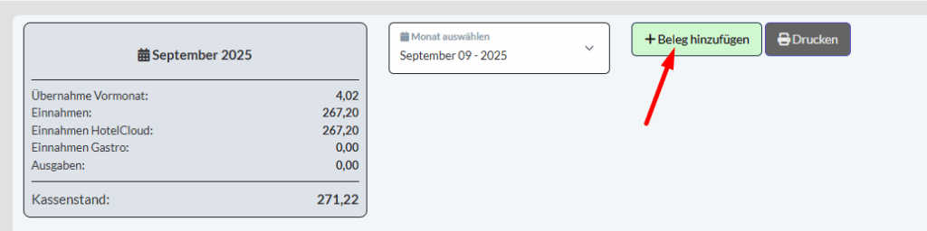 Klicken Sie auf „+ Beleg hinzufügen“ (*siehe: Eintrag im Kassenbuch hinzufügen)