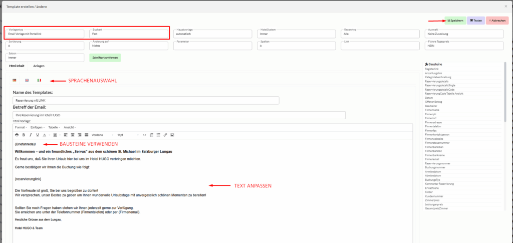 Klicken Sie im Menü auf der linken Seite auf Einstellungen – Vorlagen – Vorlagen, um Mailvorlagen mit Link zu bearbeiten und individuell an Ihren Betrieb anzupassen.