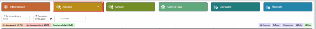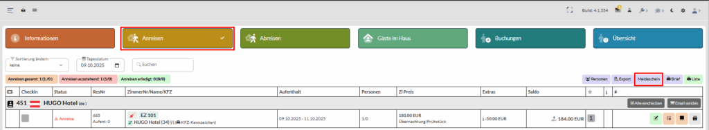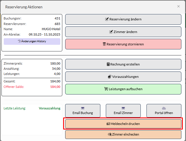 Meldeschein direkt im Zimmerspiegel je Reservierung drucken