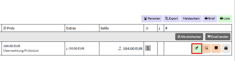 Bei jeder Anreise finden Sie rechts einen grünen Button „Reservierung Ändern“ vor. Klicken Sie auf diesen Button und anschließend in der „Reservierung Aktionen – Maske“ auf