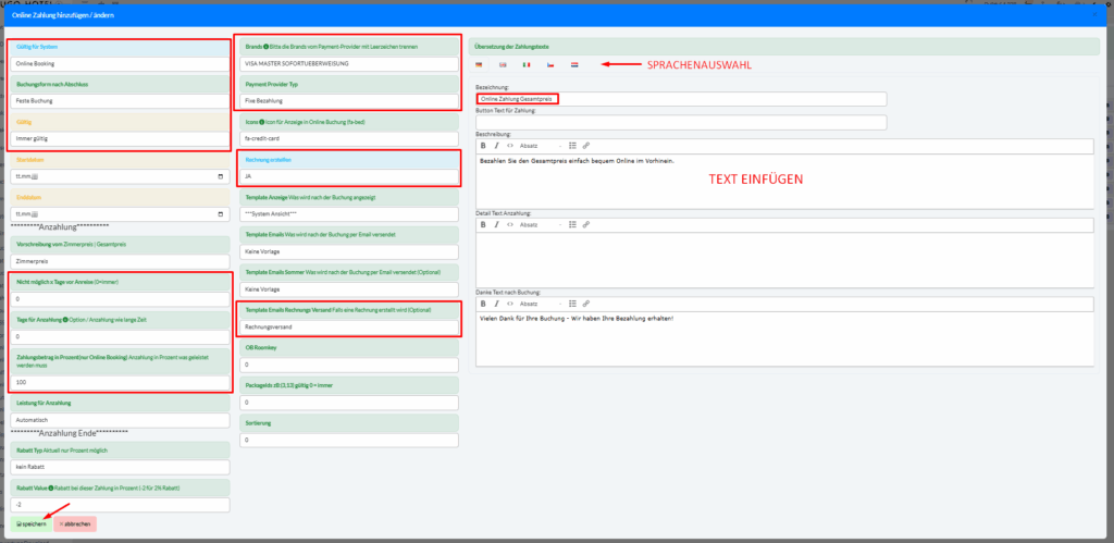Damit es zum Abschluss einer Reservierung kommen kann, muss eine Zahlungsmodalität hinterlegt sein (Zahlungsmöglichkeiten: Zahlung vor Ort, Prozentueller Anzahlungsbetrag, Zahlung Gesamtpreis, via Banküberweisung, oder wenn vorhanden mit einer Paymentschnittstelle)