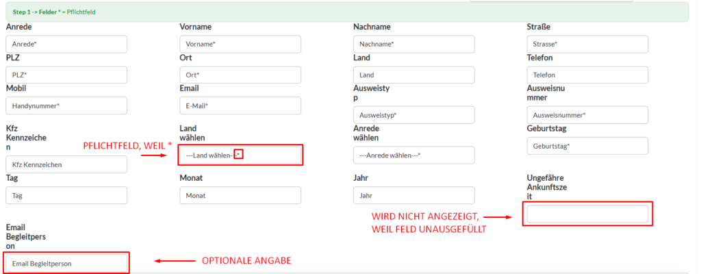 OPTIONALE ANGABE: Füllen Sie ein Feld aus, aber setzen am Ende kein *–Zeichen, kann der Gast das Feld ausfüllen, muss er aber nicht.