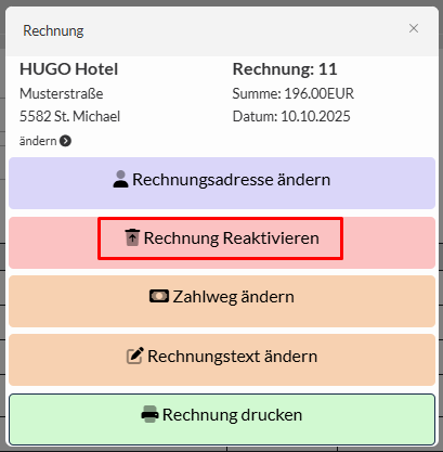 Im Anschluss auf Rechnung Reaktivieren klicken um eine Rechnung zu stornieren.