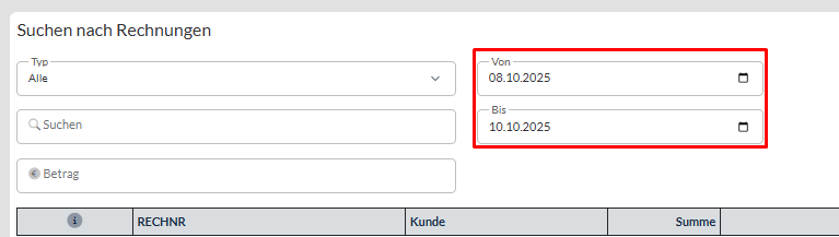 Ebenso besteht die Möglichkeit bei der Rechnungssuche, den Zeitraum zu begrenzen. Geben Sie hierzu ein Start – sowie Enddatum ein.