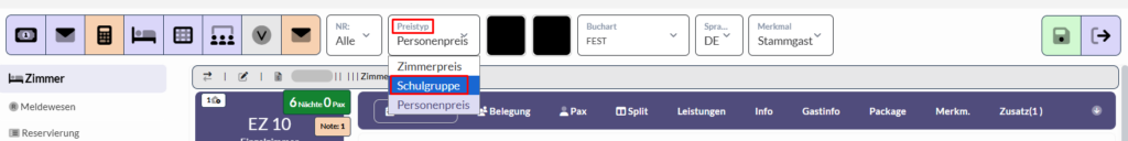 Sind alle Personen von der Ortstaxe befreit, stellen Sie den Preistyp auf „Schulgruppe„. - Vor einer Anmeldung einer Schulgruppe, achten Sie darauf, dass Sie in der Reservierung den Preistyp von „Personenpreis“ auf „Schulgruppe“ umstellen.