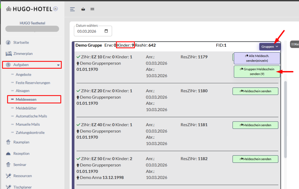 Klicken Sie bei Anreise der Gruppe im Menü auf „Aufgaben – Meldewesen“ und nachfolgend auf „Gruppenmeldeschein senden„.