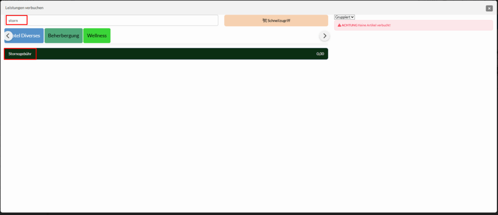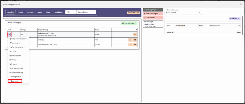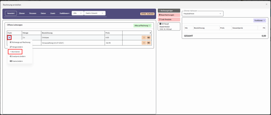 Löschen der vorhandenen Leistungen – aufbuchen der Stornogebühr in Höhe des Anzahlungsbetrages → Rechnungsbetrag = 0,00 € - Die geleistete Anzahlung wird einbehalten und dem Gast für den nächsten Aufenthalt gutgeschrieben → Erstellen einer Gutschrift