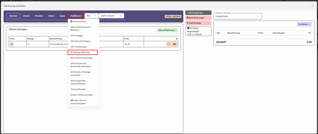 Um Leistungen zu löschen / aufzubuchen, klicken Sie auf „Rechnung erstellen“ bei der jeweiligen Reservierung. In die Rechnungslegung gelangen Sie auf unterschiedliche Wege.