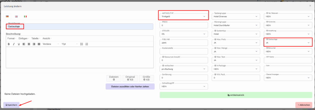 In der 3. Spalte eines/r jeden Artikels / Leistung finden Sie die Einstellungsmöglichkeit „Gastauslage„, welche auf „JA“ umgestellt werden muss.