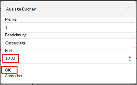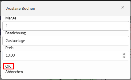 Buchen Sie die gewünschte Barauslage / Gastauslage auf das jeweilige Zimmer auf, hinterlegen Sie den Betrag / Preis und bestätigen mit „OK„.