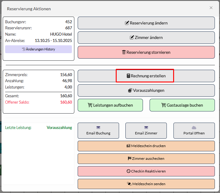 Klicken Sie auf die gewünschte Reservierung mit der linken Maustaste und wählen in der Maske „Reservierung Aktionen“ den Button „Rechnung erstellen“ aus.