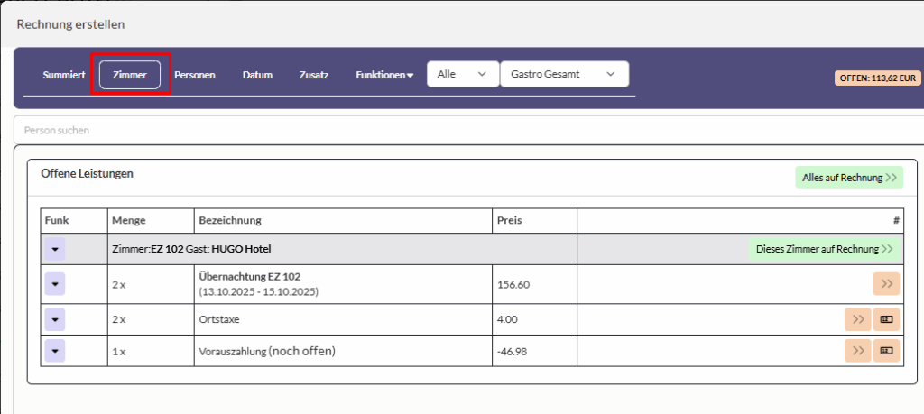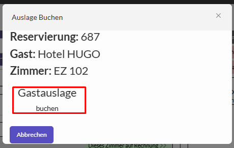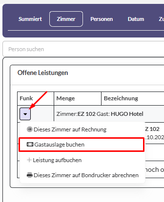 Um eine Gastauslage / Trinkgeld zu buchen, muss das Zimmer im System eingecheckt sein.