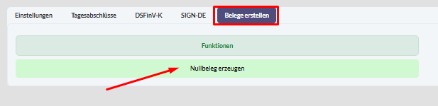 Klicken Sie im Menü auf der linken Seite auf Einstellungen – TSE – Belege erstellen – Nullbeleg erzeugen.