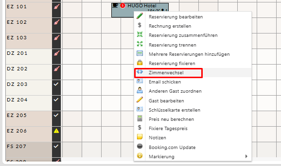 Klicken Sie im Zimmerspiegel mit der rechten Maustaste in die Reservierung und wählen Zimmerwechsel aus.