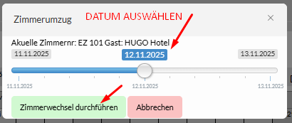 Im neu geöffneten Fenster wählen Sie ein Datum aus und klicken dann auf Zimmerwechsel durchführen.