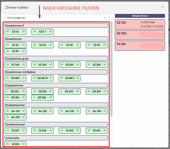 Wählen Sie ein freies Zimmer in der Gesamtansicht oder filtern Sie nach Zimmerkategorien. Mit Klick auf ein freies Zimmer verschwindet die Maske und die Reservierung wird mit einem Pfeil verbunden im Zimmerplan angezeigt. *