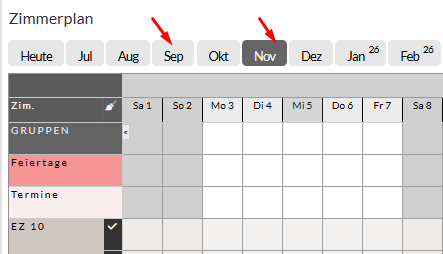*Es ist durchaus möglich, dass Sie den Pfeil nicht sofort nach Ihrer Eingabe sehen können. Um die Veränderung zu sehen, klicken Sie zwischen zwei unterschiedlichen Monaten hin und her, damit sich der Zimmerplan aktualisiert.