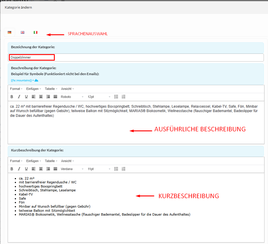 Die „Bezeichnung der Kategorie„, „ausführliche Zimmerbeschreibung“ und die „Kurzbeschreibung„, werden dem Gast im Portal, den E-Mails (Baustein: Reservierungsdetailcode) und der direkten Buchungsstrecke angezeigt.