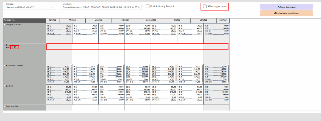 Mit Klick auf „Ableitungen anzeigen“ werden die Preis Ableitungen der Zimmerkategorie eingeblendet.