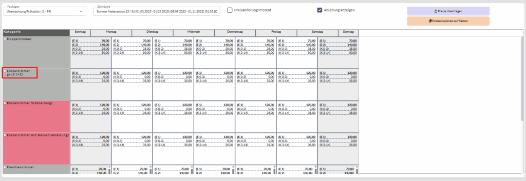 Durch die Preisableitung wird der Preis auf all jene Kategorien, welche mit der Hauptzimmerkategorie durch die Preis Ableitung verknüpft wurden, 1:1 übertragen. So müssen Sie die Preise nur für die Hauptzimmerkategorie hinterlegen.