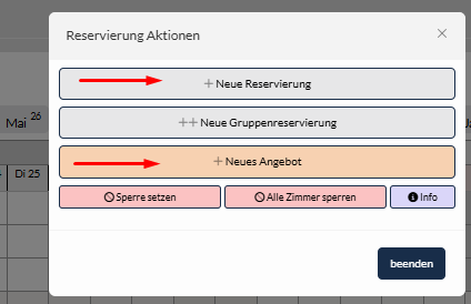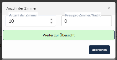 Sie ziehen ein Angebot/Reservierung im Zimmerspiegel im Einzelzimmer auf, wählen „Angebot“ oder „Reservierung“ aus und geben bei „Anzahl Zimmer“ die Zahl „10“ ein.