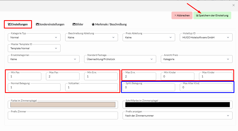 - Max Kinder: Geben Sie die Maximale Anzahl an Kindern an, die in der jeweiligen Zimmerkategorie Platz haben.