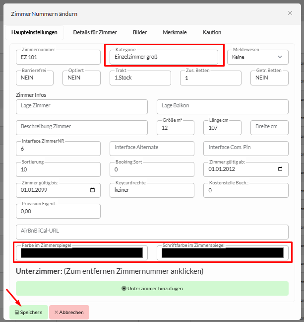 Wenn Sie die Zimmerspiegelfarbe je Zimmer anders gestalten möchten, hinterlegen Sie direkt beim Zimmer die gewünschte Farbe und hinterlegen Sie bei der Kategorie die Farbe Schwarz – Schwarz.