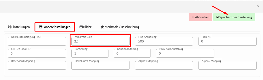 Wenn Sie für eine Zimmerkategorie mindestens immer den Betrag € x erhalten wollen, gleich ob bei Einzelnutzung oder Doppelnutzung, hinterlegen Sie bei Min Preis Calc den Wert von z.B. 2,5 (Erwachsenen) – Denken Sie sich an dieser Stelle das Wort „Erwachsene“ dazu.