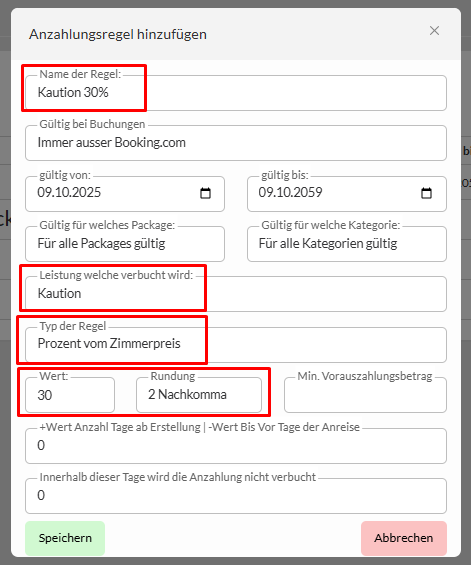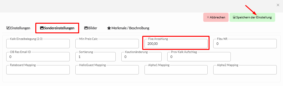 Möchten Sie für alle Zimmerkategorie die gleiche Anzahlung haben, nur für eine einzige nicht, können Sie für diese eine Zimmerkategorie bei „Fixe Anzahlung“ einen Anzahlungsbetrag in € eingeben.